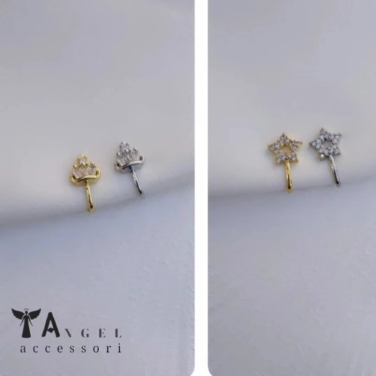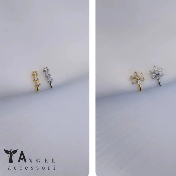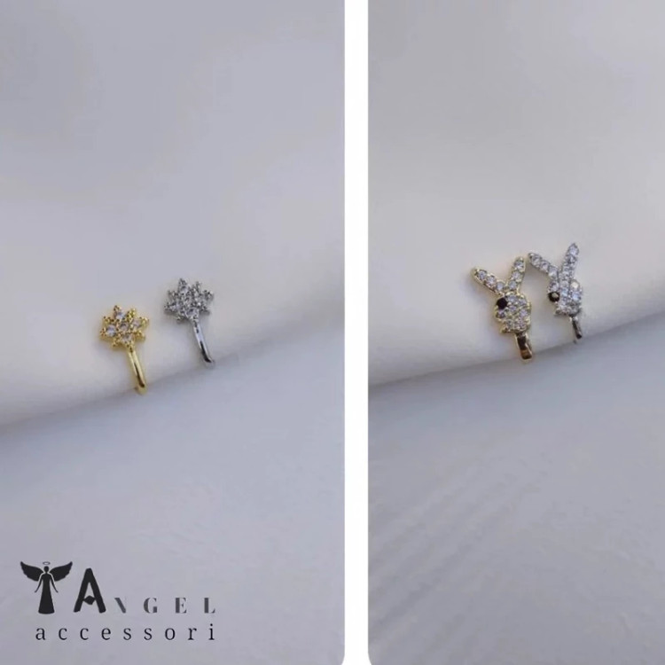 پیرسینگ فیک برای بینی و لاله گوش قرار میگیره بدون نیاز ب سوراخ با دست دو ثانیه ای راحت وصل میشه و با دست محکمش میکنید خیلی شیک و ظریف نگین کاری درجه یک جنس استیل در رنگ های نقره ای و طلایی خیلی شیک در طرح های مختلف برای موجودی طرحها چت بدید ممنون